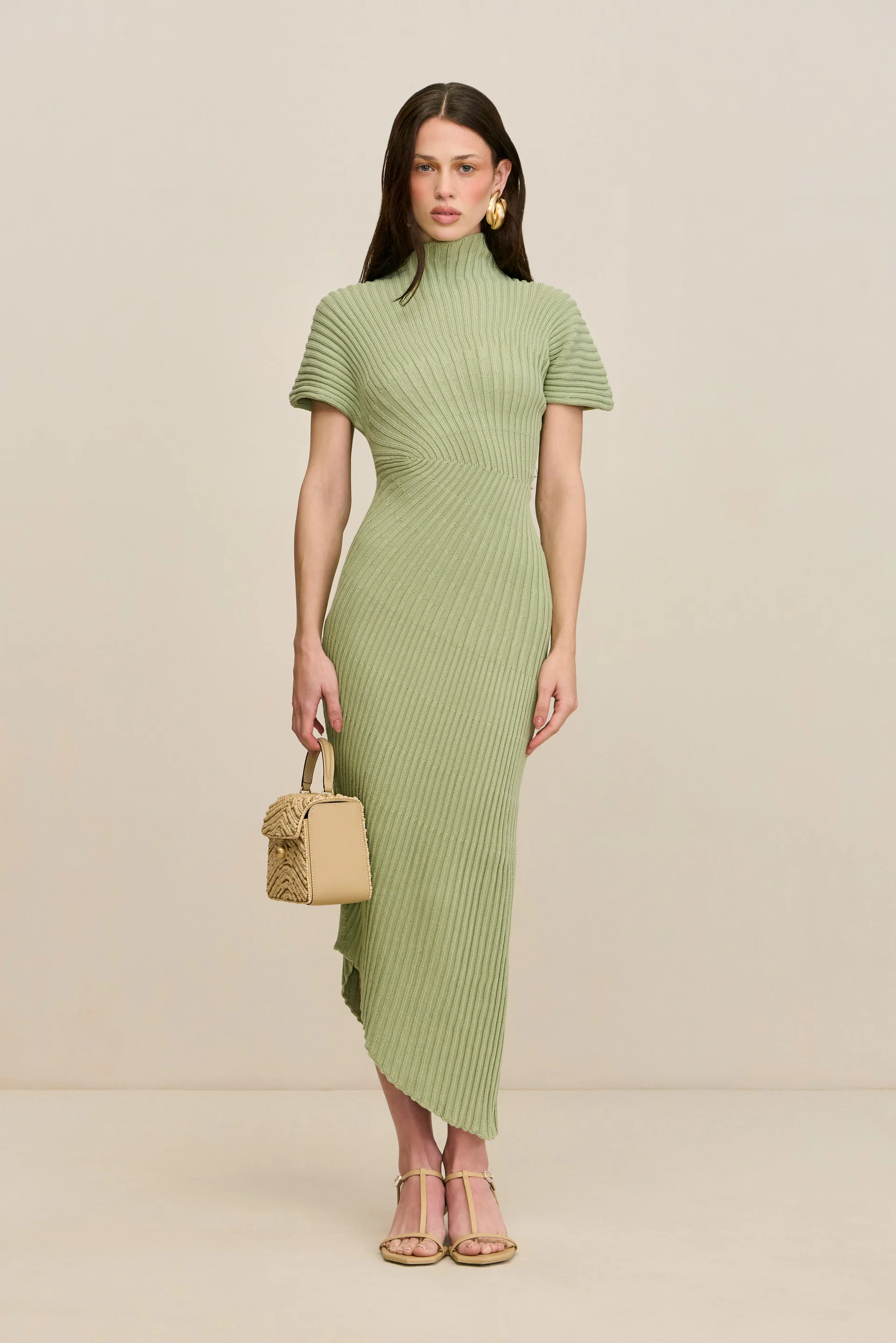 A midi knit dress with radial stitch detailing that features an asymmetrical mock neck and hem line.
