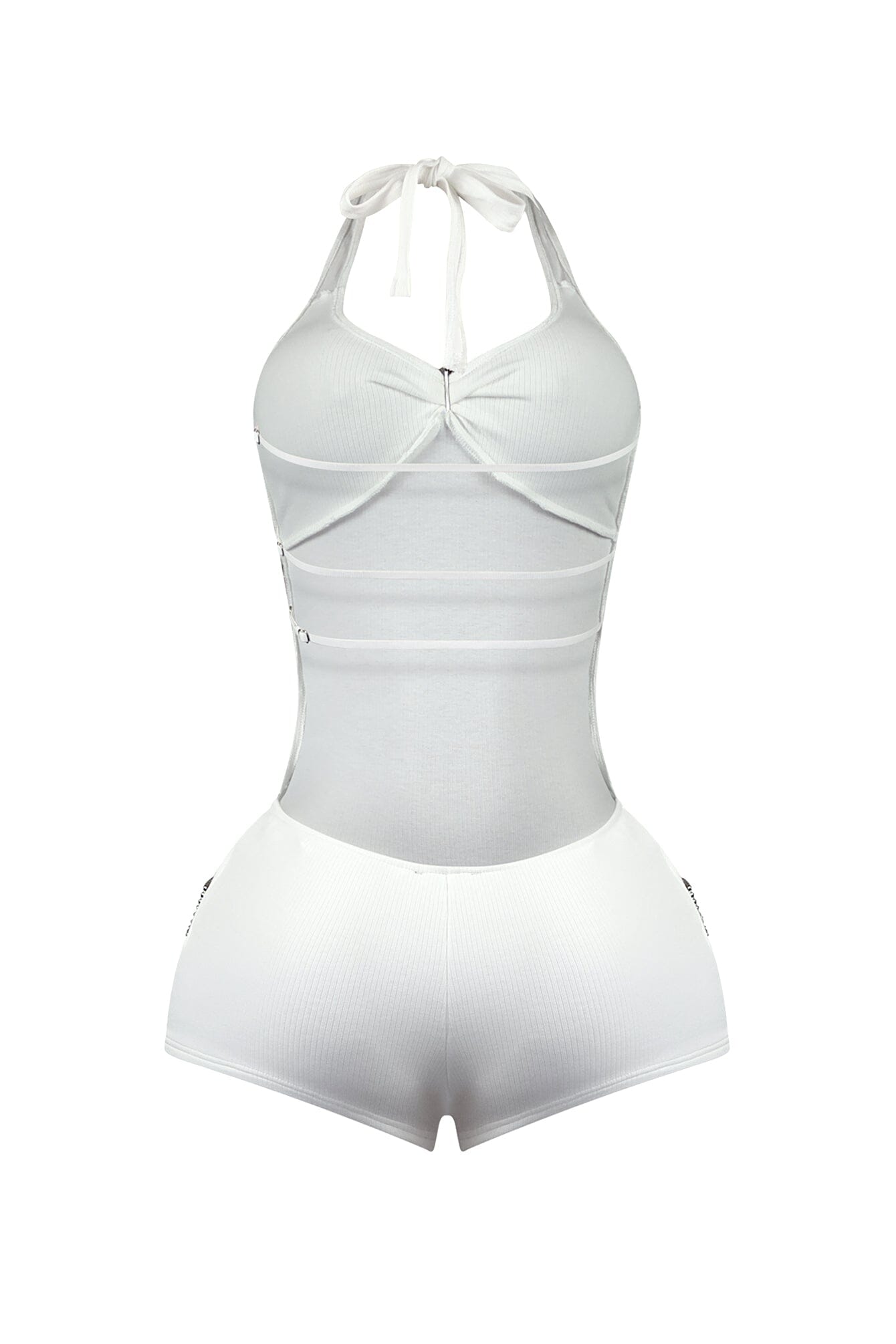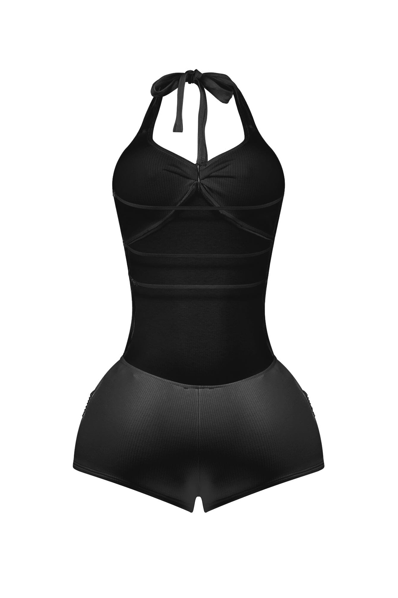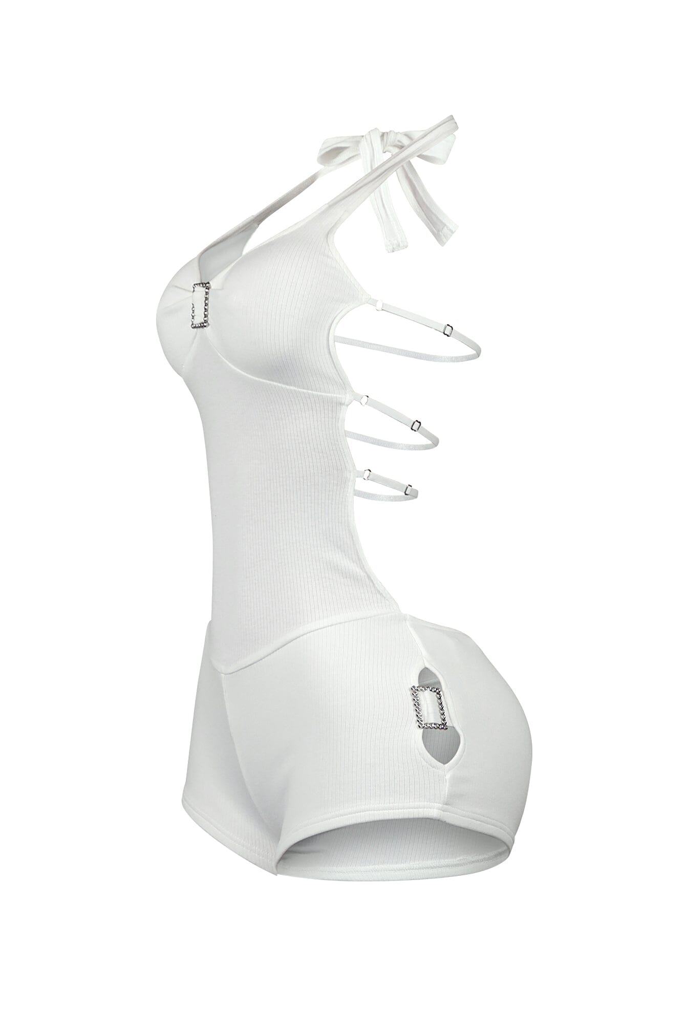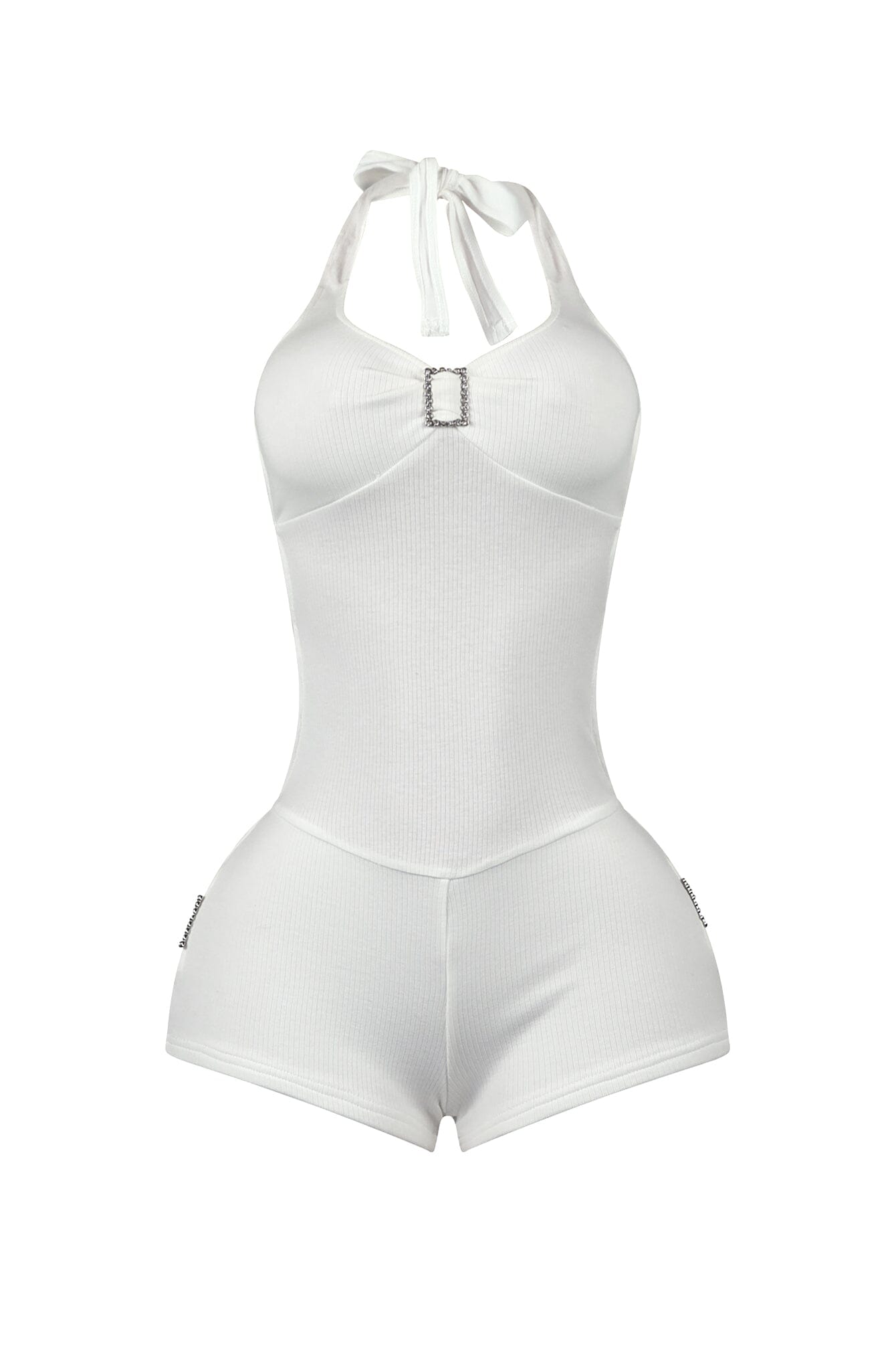 Ribbed halter micro romper featuring a bustier design and rhinestone details