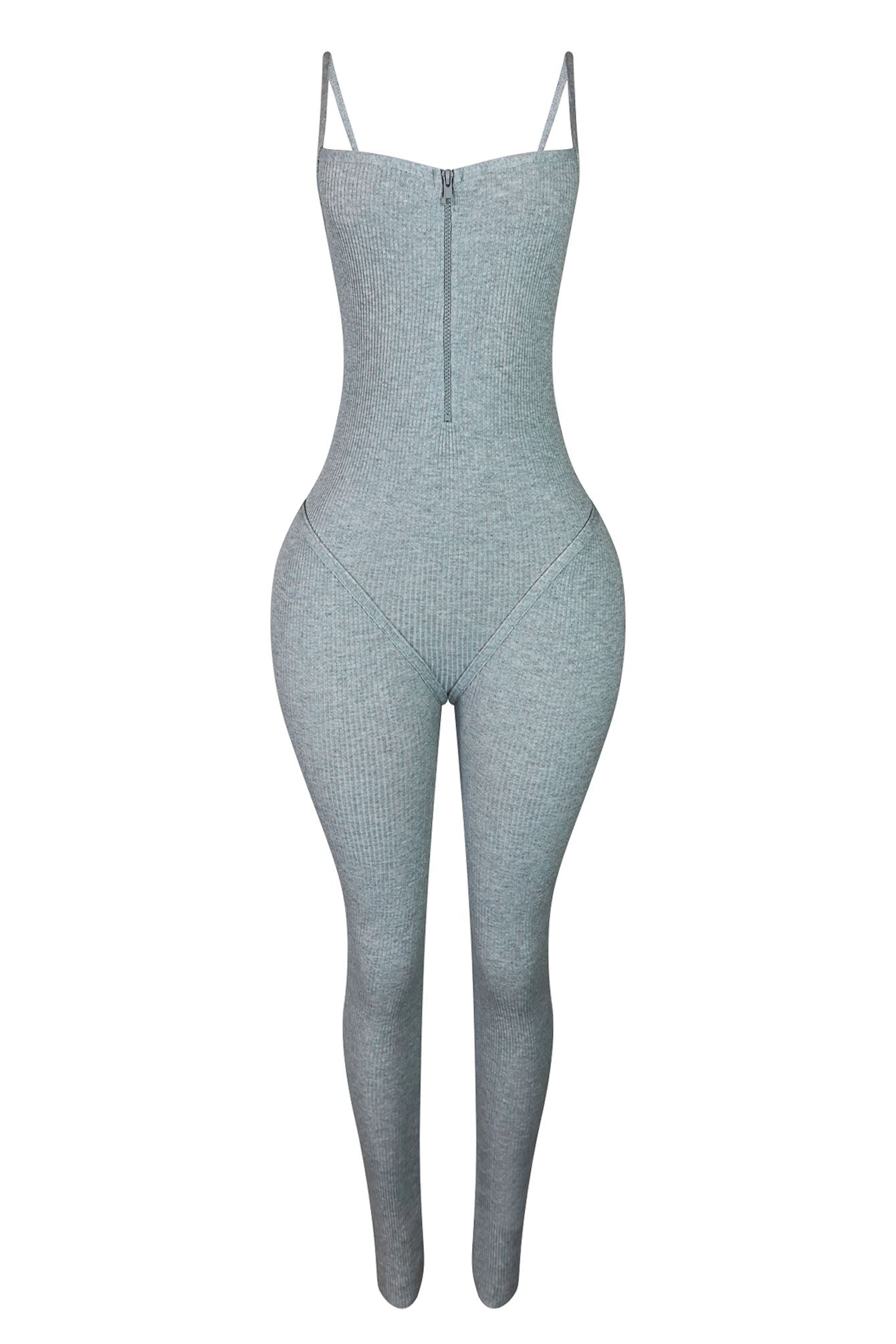 Tank ribbed knit romper featuring piping contour with front zipper