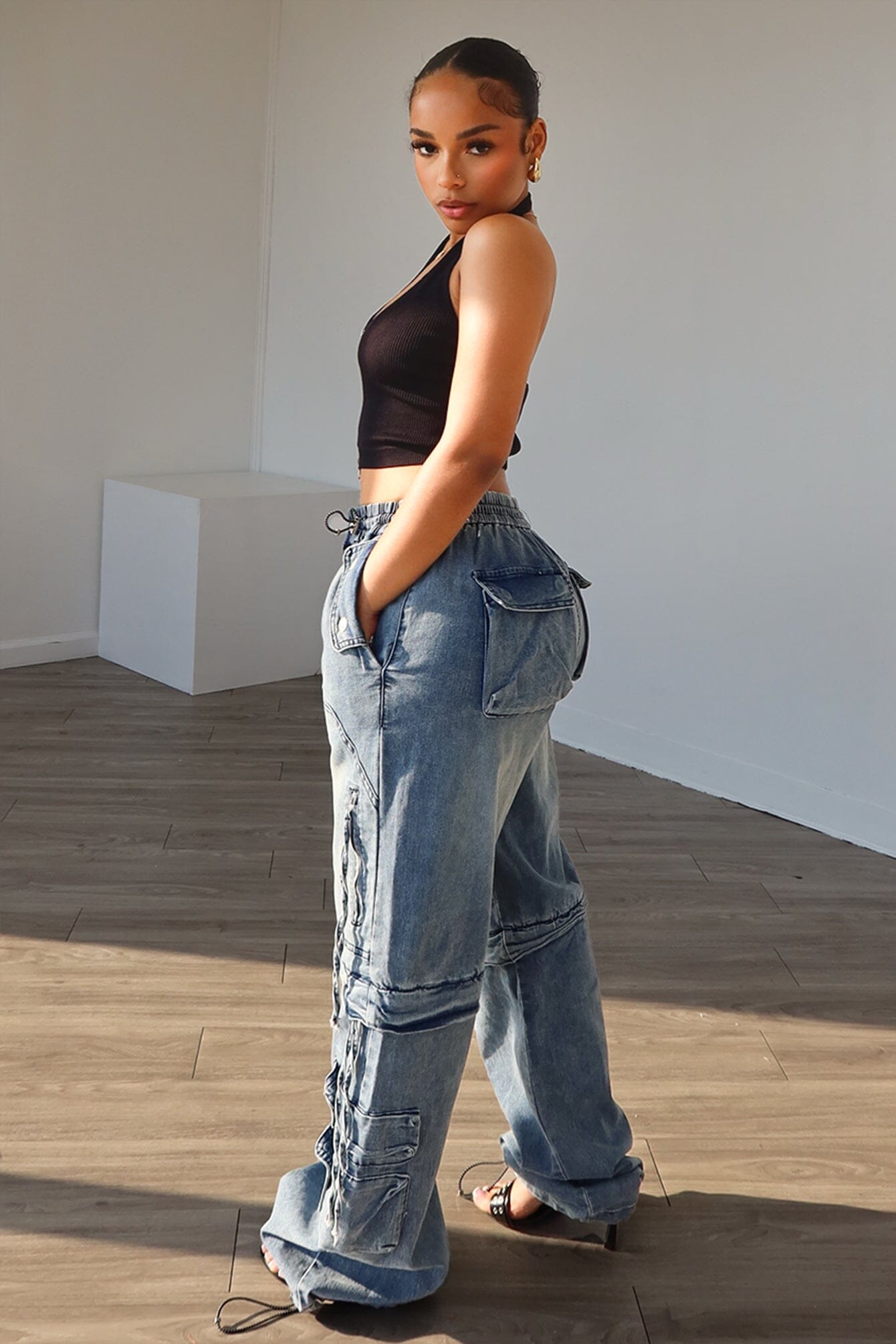 Denim baggy jeans featuring cargo pocket details front and back