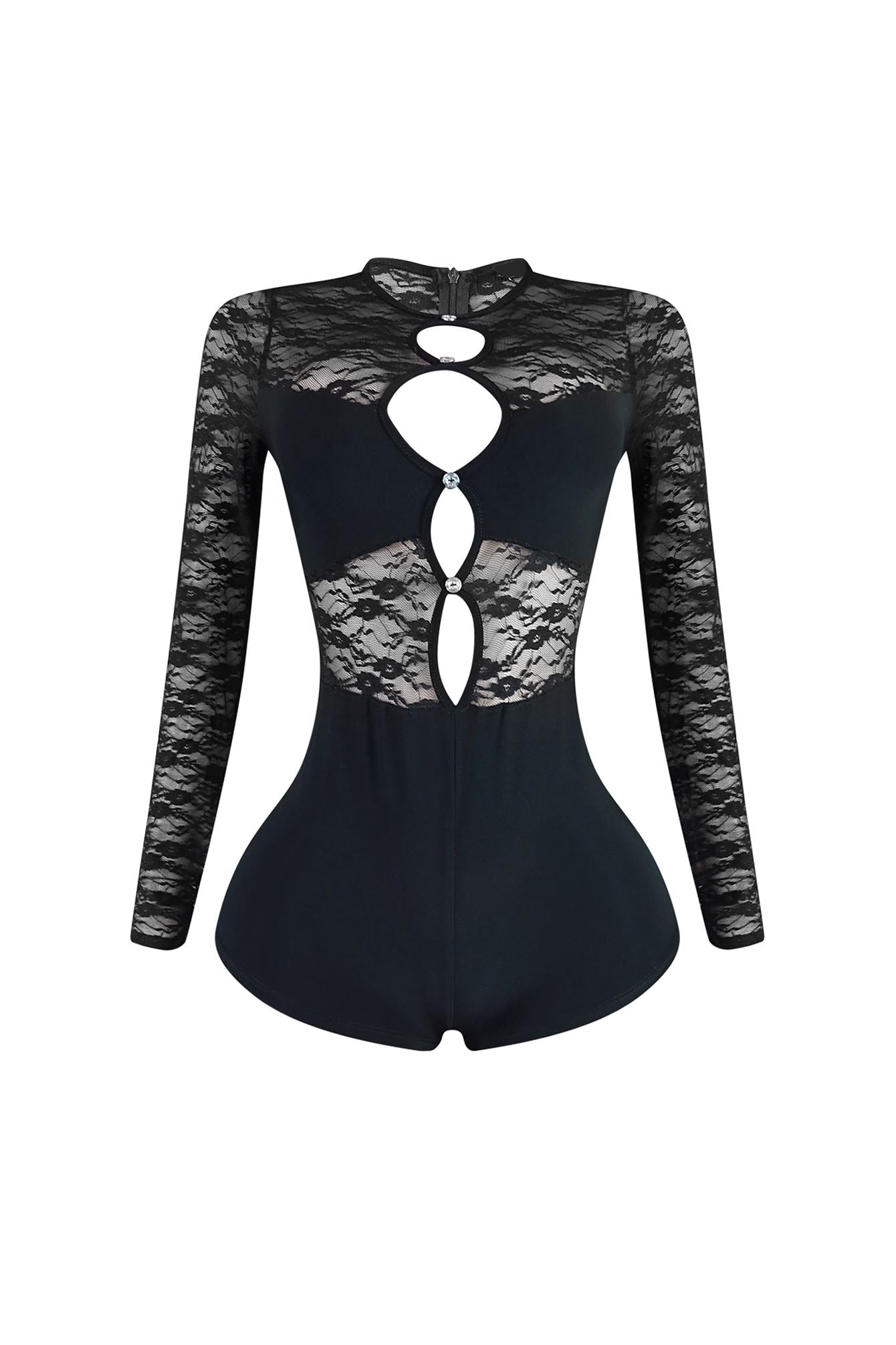 Contrast lace mesh romper featuring cut out with rhinestones detail