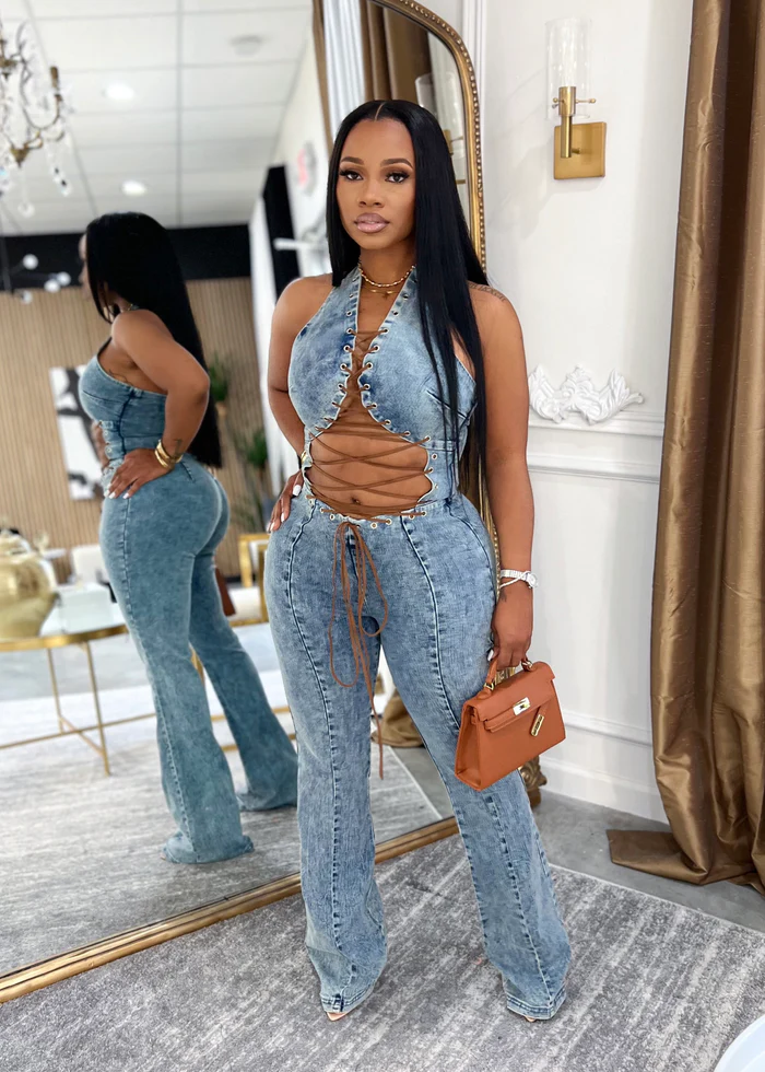 Model 5’2 wearing a size small has stretch back zipper closure lace up front halter top 65% cotton 33% polyester 2% spandex